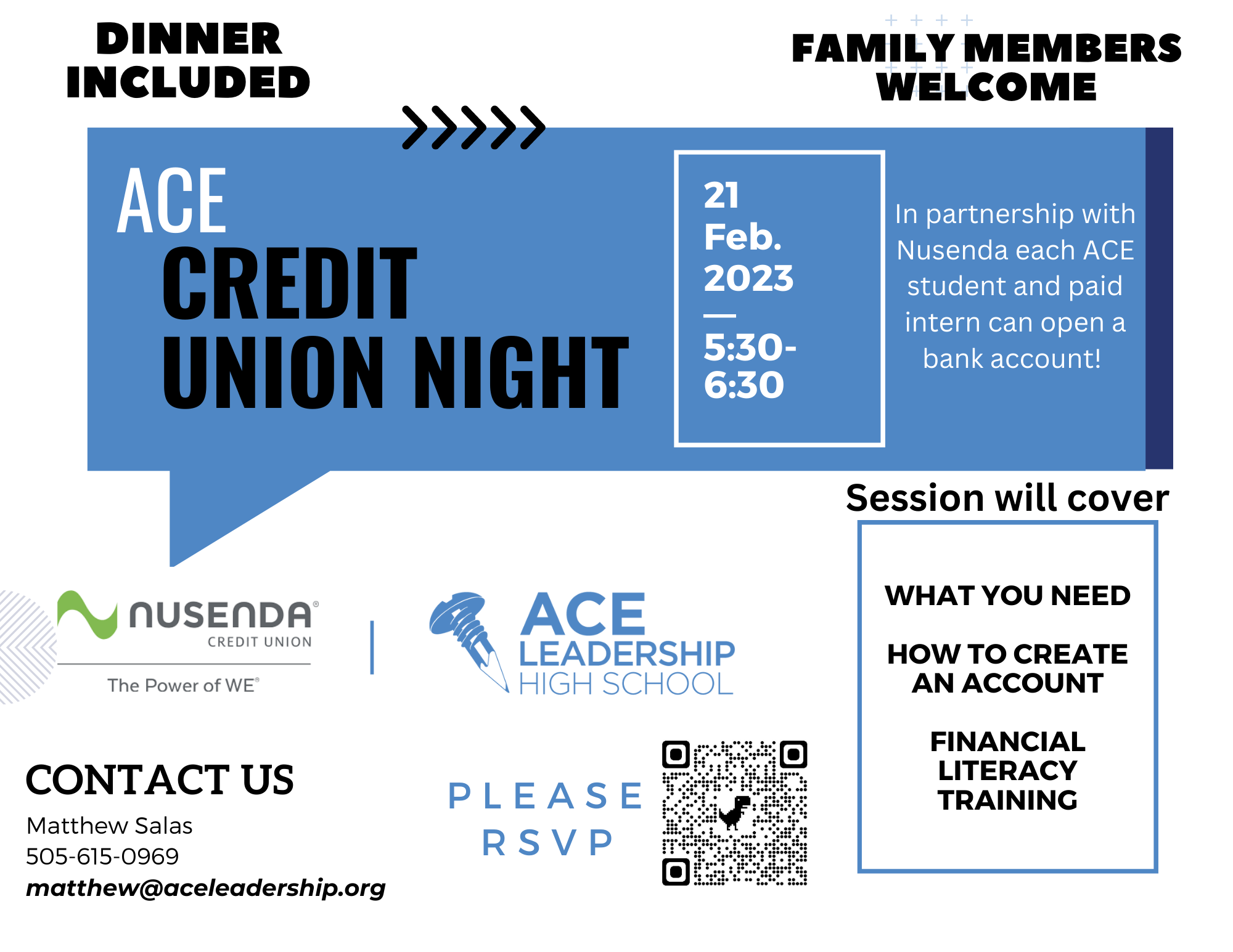 Nusenda Family Night + Add to Google Calendar + iCal / Outlook export Date Feb 21 2023 Expired! Time 5:30 pm - 6:30 pm Location Ace Leadership High School 1240 Bellamah Ave NW, Albuquerque, NM 87104 Organizer Matthew Salas Phone 505-615-0969 Email matthew@aceleadership.org Share this event